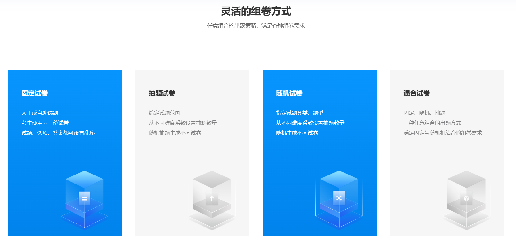 考試云提供固定試卷、隨機試卷、抽題試卷、混合試卷四種組卷模式,靈活適配各類考試與競賽場景。