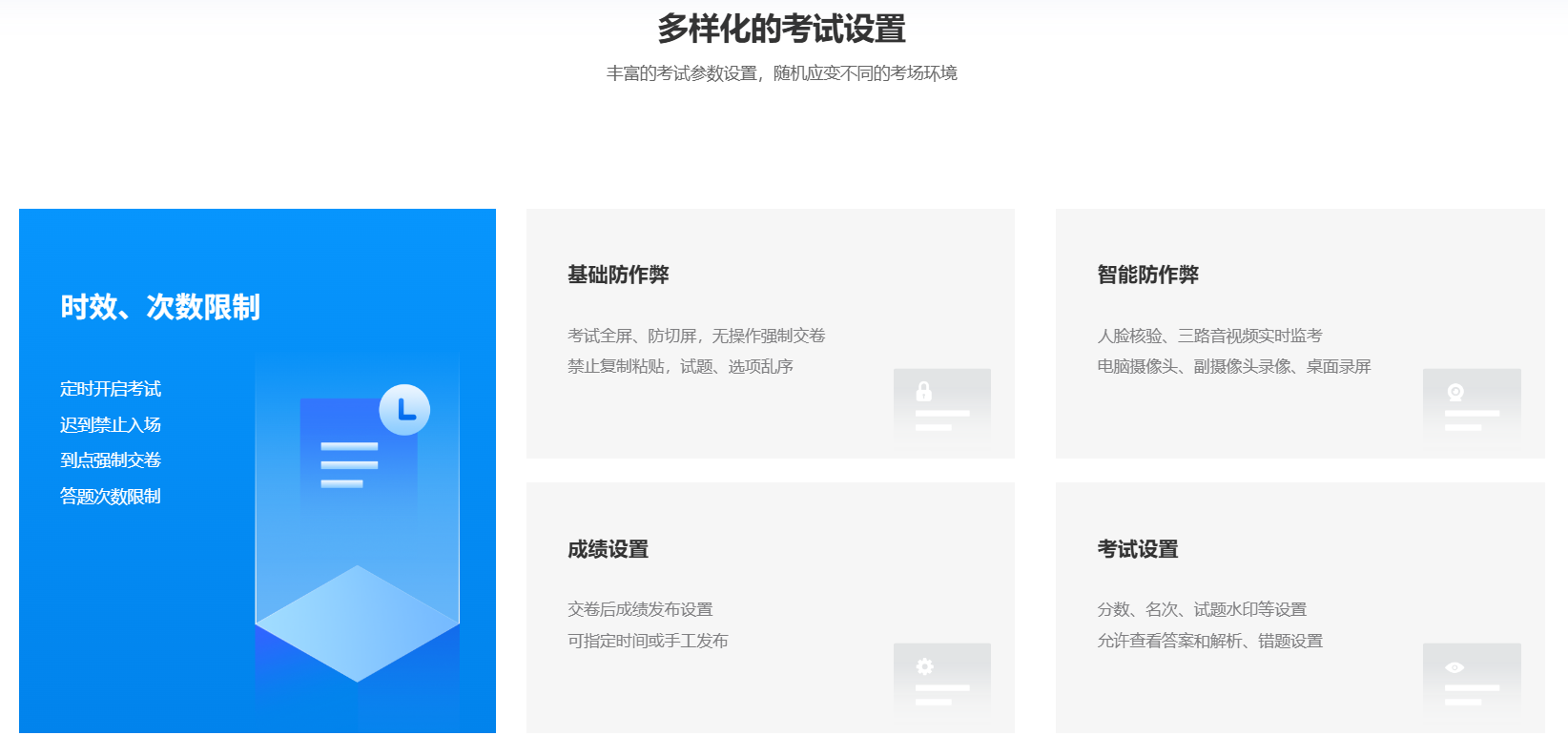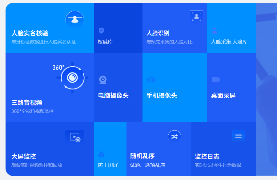 考試公平是在線考試的生命線。考試云構(gòu)建了多層次、全方位的防作弊體系,確??荚囘^程真實可信。
