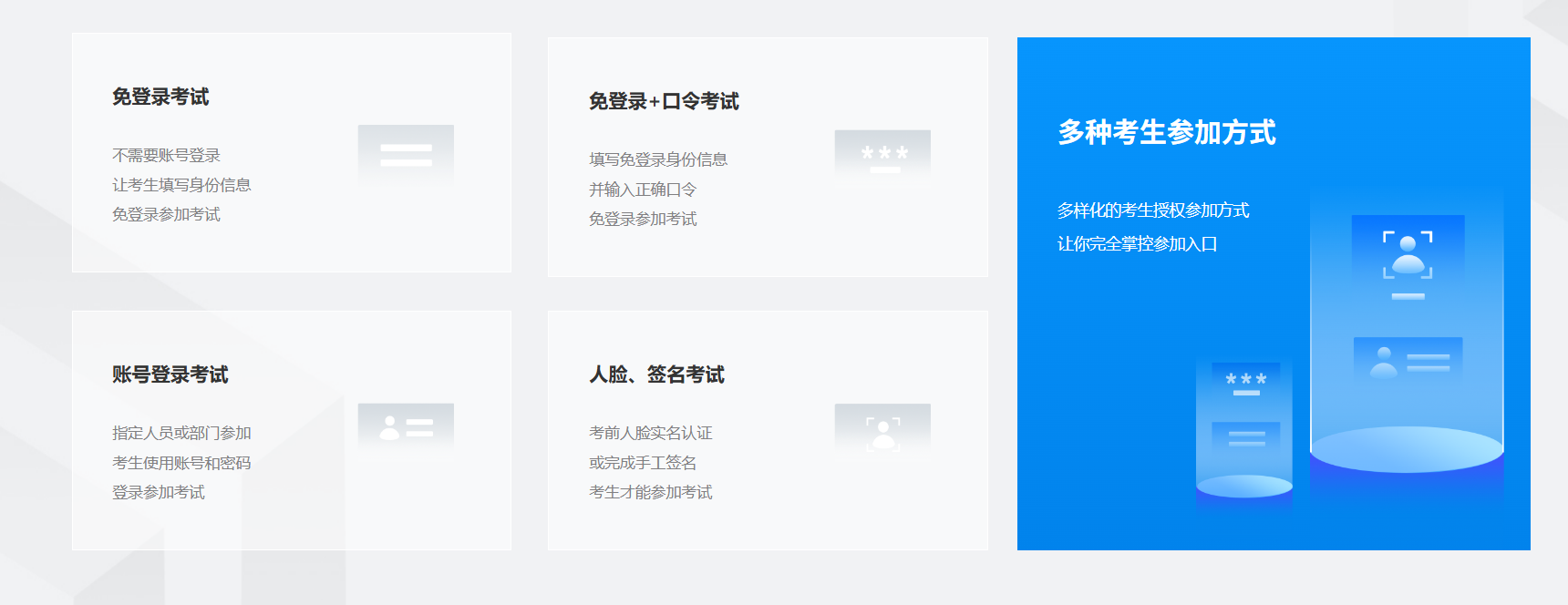 為滿足不同組織的管理需求,考試云提供四種考生授權(quán)方式: