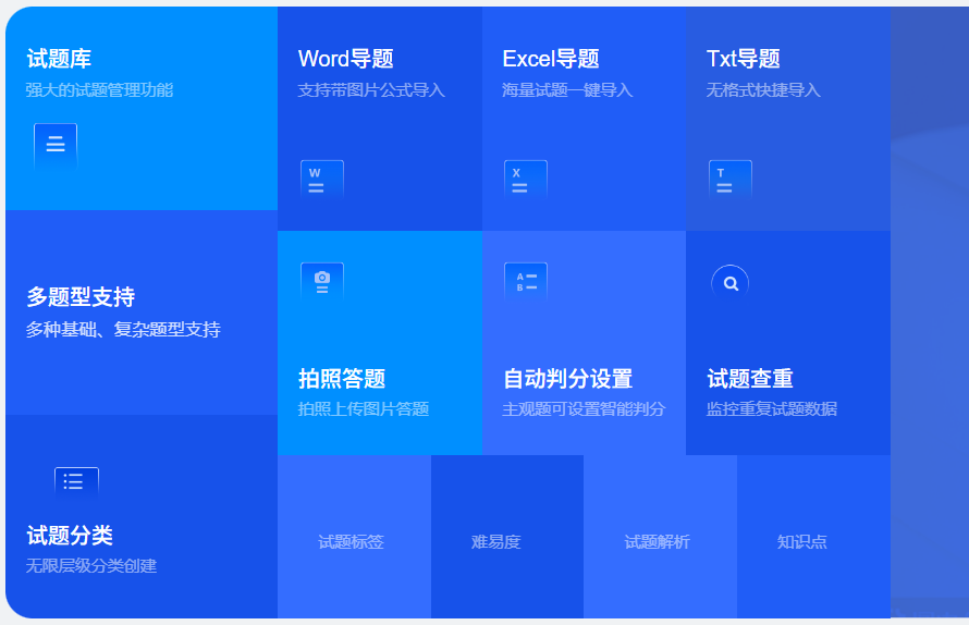 此外,考試云還支持題庫分類管理、標簽化檢索、難度分級設(shè)置,便于后續(xù)靈活組卷與數(shù)據(jù)分析。