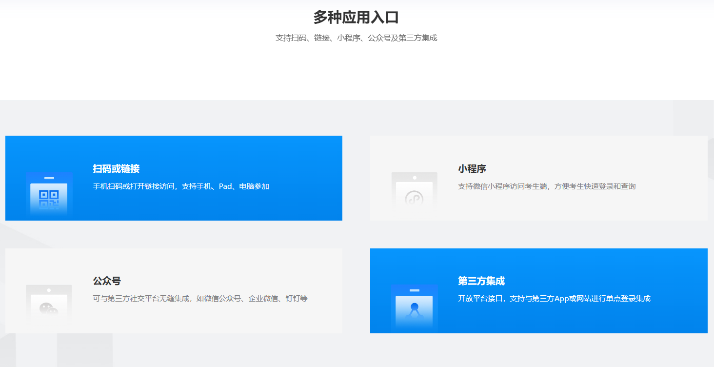 考試云支持PC端、手機端(微信公眾號、小程序、APP)、平板等多終端接入,考生只需掃碼或點擊鏈接即可進入考場,無需安裝額外軟件。尤其適合跨地域、分散式參賽的場景,如全國性技能大賽、企業(yè)跨區(qū)域員工競賽等。