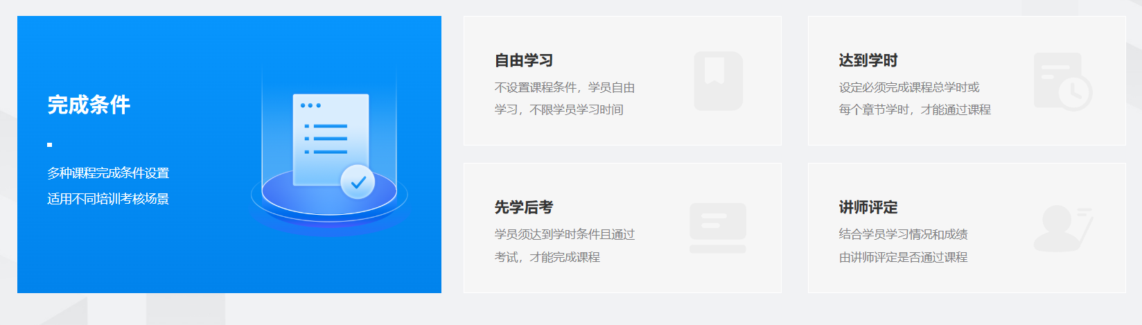 這是考試云最具特色的功能之一。平臺(tái)支持設(shè)置“課程完成條件”,例如: